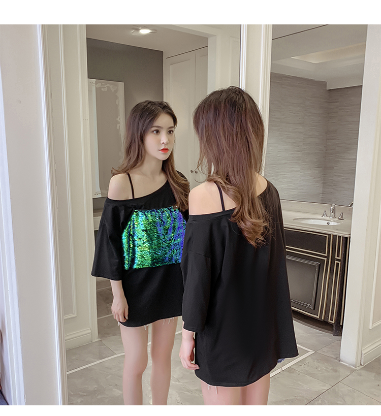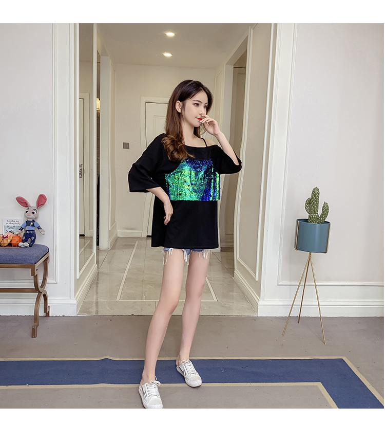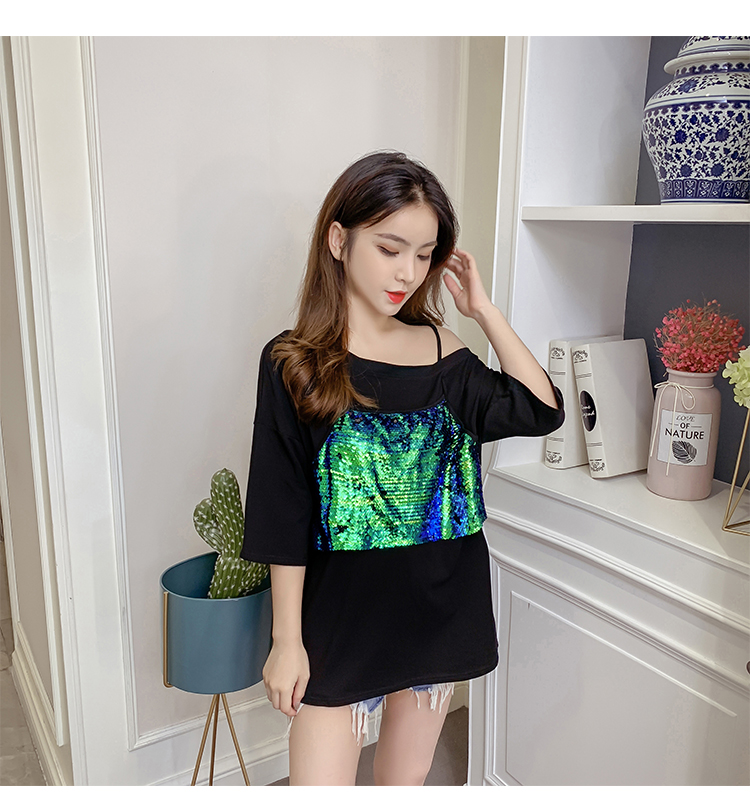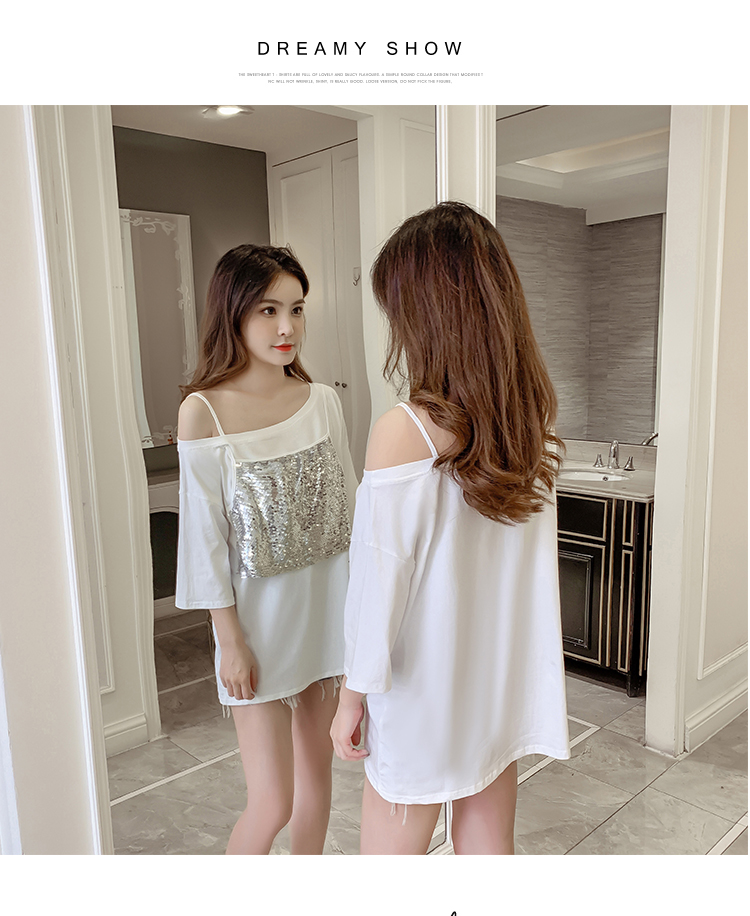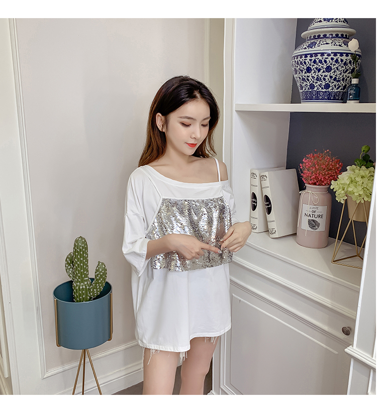 > VK旗艦店 韓系時尚寬鬆閃閃亮拼接假兩件T恤短袖上衣