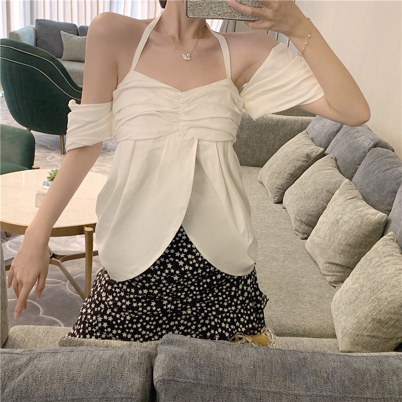 > VK旗艦店 韓國風不規則掛脖褶皺一字領短袖上衣