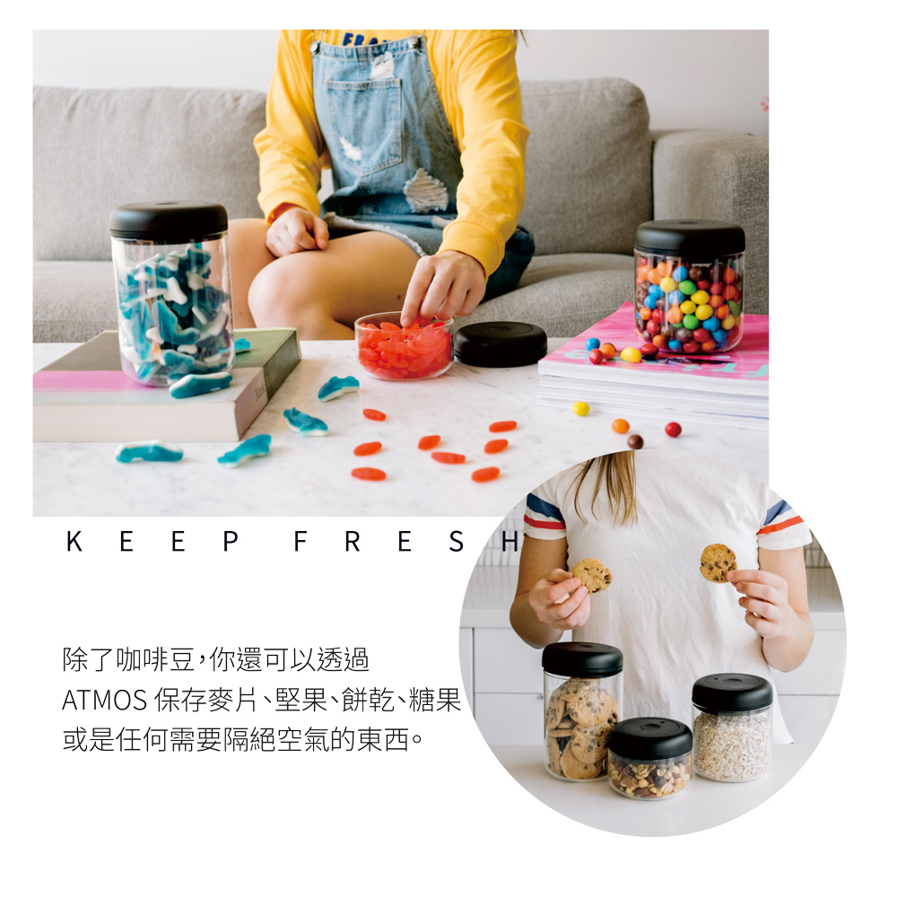 <iframe width="100%" height="500px" src="https://www.youtube.com/embed/Vsq_WfZEb7c" alt="Fellow Atmos 不鏽鋼真空密封罐-1.2L" title="Fellow Atmos 不鏽鋼真空密封罐-1.2L" frameborder="0" allow="accelerometer; autoplay; encrypted-media; gyroscope; picture-in-picture" allowfullscreen></iframe>空氣中的氧氣會讓咖啡氧化,讓你精心選購的咖啡豆無法發揮他應有的風味潛力!FELLOW ATMOS真空密封罐將能抽除空氣、水分和異味,有效減緩咖啡豆氧化。內建的真空幫浦能將空氣排出,最多能將咖啡的保存週期延長50%的時間!內建真空幫浦前後旋轉蓋子的外環,內建的幫浦會抽出內部空氣,不再需要透過任何工具去抽真空!真空的秘密都在蓋子中!真空鎖定指示看到指示點內側的綠色環代表目前內部是保持真空的狀態可以避免食物氧化及延長咖啡豆的保存時間。輕鬆釋放真空設計當真空罐裡的食物在呼喚你時,只要輕輕按壓中間的釋放鈕,密封罐內的壓力隨即會恢復正常。氣密矽膠密封阻止空氣、水分、氣(異)味和其他物質的進出。三種容量兩種材質選擇我們提供您三種常用容量選擇,0.4公升(L)、0.7公升(L)和1.2公升(L)。並提供您透明玻璃及不透明的啞光黑不鏽鋼罐身材質讓您選擇,滿足您的各種使用需求。